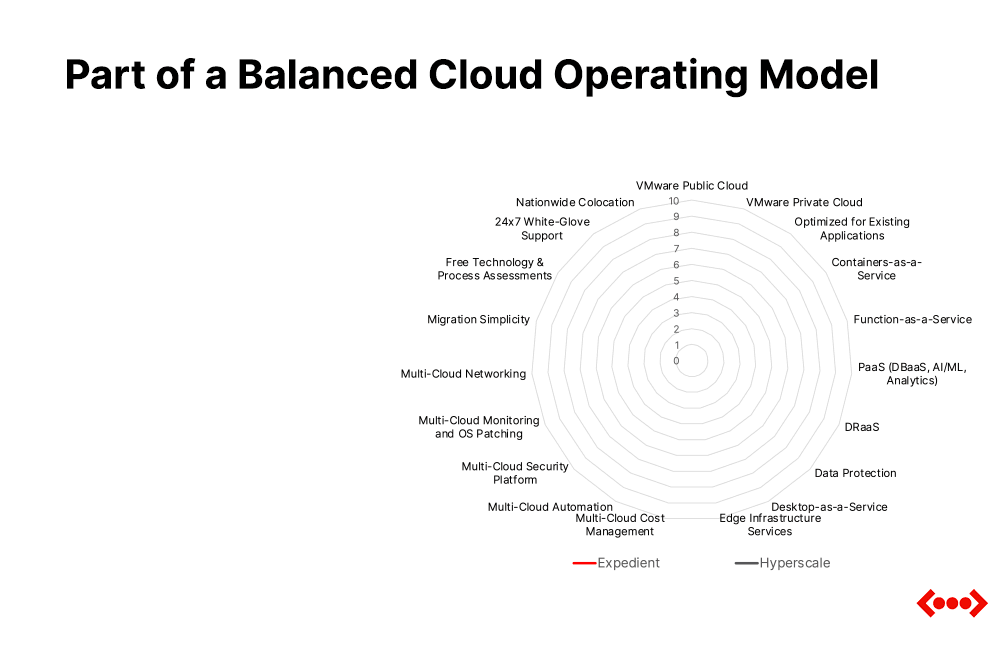 Now look at your cloud technology. A balanced cloud operating model has everything you need, starting with AI/ML and other public cloud tech, enterprise cloud, colocation, and probably even some on-premises. Like the healthy breakfast shown in the ads, this is to make sure you get a well-rounded meal and cover your bases with legacy applications, mission-critical hardware and servers you can’t give up, disaster recovery environments, compliance requirements, and VMware-based workloads you can’t just lift-and-shift to the public cloud. (You can decide which part of that is the sugary cereal you eat straight from the box by the handful and which is the bran muffin you begrudgingly eat because you know it’s good for you).