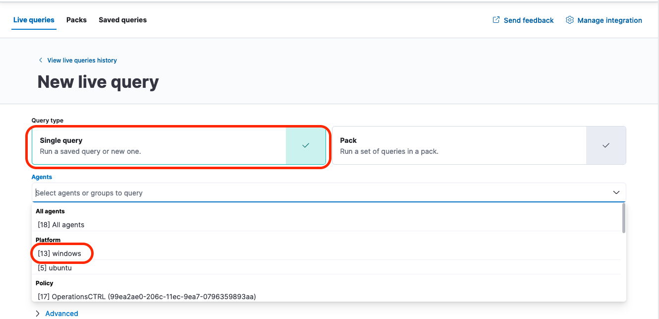 - Choose the “Single Query” type and then select which agents you which to run the query over. In this case we will be targetting our windows hosts, but a similar approach can be used to search for applications on mac and linux, and you can also break down your search by agent policy rather than platoform.
