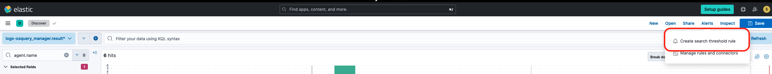 - Finally, from here you can click on “Alerts” to begin creating an alert that can notify you of any time a machine shows up in your network using a version of software below your minimum target. To begin this process click on “Alerts” in the upper right hand corner of the screen and select ‘Create search threshold rule’. This will allow us to create a rule that will generate an alert any time more than a set number of documents are returned by a search. In this case we’ll set the threshold to 0 so that we can get an alert for any out-of-date application.
