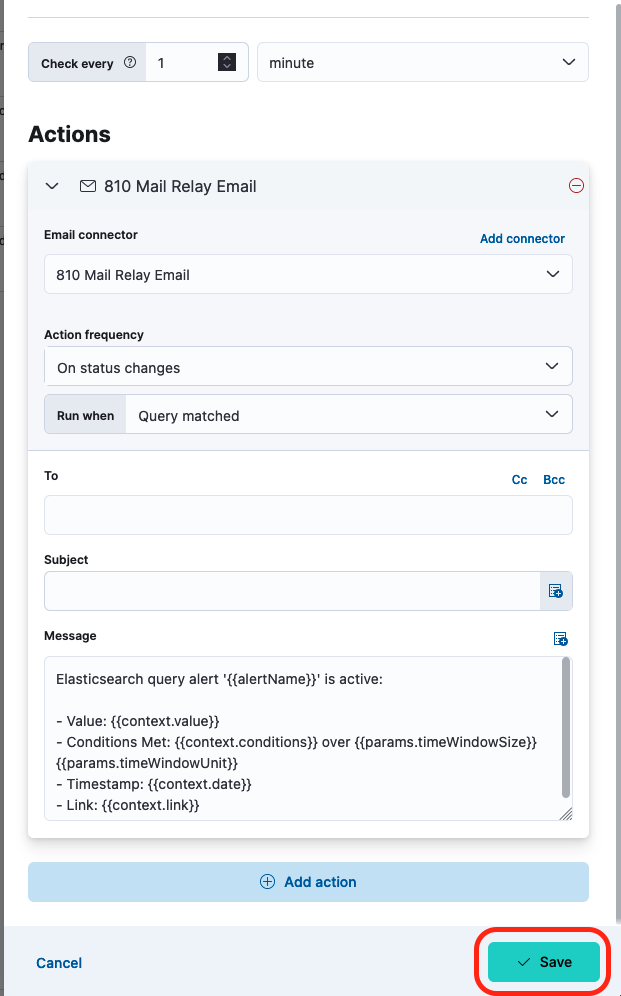 - The settings below will run the query every hour and save the results to your elastic instance for later review and to power alerts