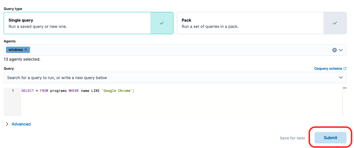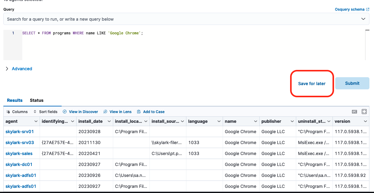- Create an OSquery query that will list all machines with a given application installed in this case we are using Google Chrome but this can easily be extended to any other application you want to search for. For anyone unfamiliar, OSquery enables you to query your systems using a SQL-like language. Elastic helps to resolve the inventory and networking complexity usually involved in utilizing osquery across a large network. more information on osquery is available here. once your query is written, click “Submit”