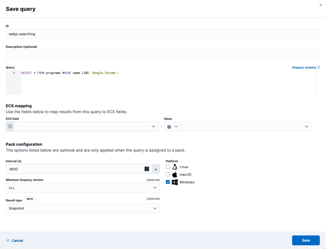 osquery.version < 117. This query may not work on older versions of elastic which do not have native support for automatically converting the version string in theosquery.versionfield into a format you can performa a numberical comparison against. In those cases an update to the current version would be reccomended, if that is not possible you may be able to leverage a runtime field to accomplish the same conversion